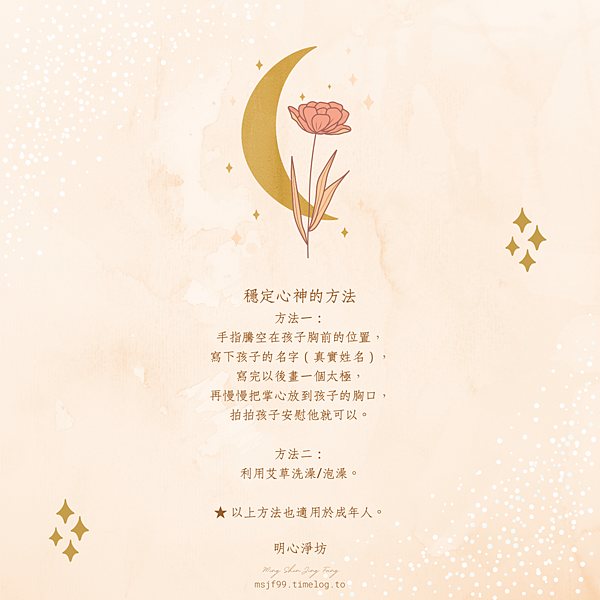 此方法不僅適用於受到驚嚇的孩子,身為大人的我們覺得自己很恍神或是心神不定時,也可以請人這麼對自己做,要注意的是這需要請人幫我們做的原因是,我們自己很難看著自己寫自己的名字,當然若是看著鏡子做也是行,但就是要注意我們寫的字和畫的太極要是相反的才可以,這樣從鏡子反射以後才是正體的字。