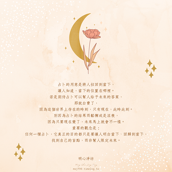 重要的觀念是:任何一種占卜,它真正的目的都只是要讓人明白當下、回歸到當下,找到自己的盲點,而非幫人限定未來。